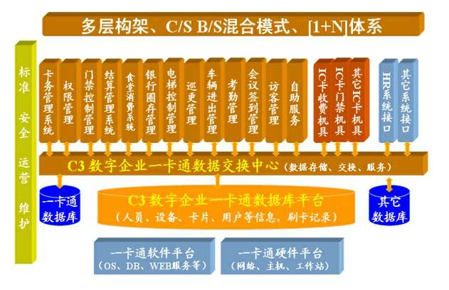 一卡通系统采用混合C/S、B/S模式的多层体系,以“平台+应用”的1+N架构,即是以控制台、人员信息、设备卡和账套平台为基础,可实现权限管理、消费管理、银行圈存、门禁管理、考勤管理、巡更管理、会议签到管理、访客管理、停车管理、电梯控制、综合服务等,同时可实现与HR系统、安放系统等系统的集成,并且可随着以后业务需求增加而扩展,无需改变平台.